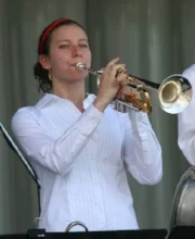 Kate Amrine played trumpet with the band in 2009-10 while a student at Walt Whitman HS. Kate also played in the Jazz Academy Orchestra and the Blues Alley Youth Orchestra, and was a semifinalist in the National Trumpet Competition. Kate was selected for the All-County and All-State Jazz Ensembles, and was accepted into the Eastman Summer Classical, Jazz, and Trumpet Institute programs. She went on to earn degrees from New York U., where she now teaches, and Peabody Conservatory. Kate also teaches at the Brooklyn Conservatory of Music. She plays in the Hot Shim Sham Orchestra, Swingadelic, the Ross Kratter Big Band and other jazz and classical ensembles and musicals (on and off Broadway) in New York City, and has performed at Alice Tully Hall and Carnegie Hall. She has toured nationally and in Japan. Kate also composes, and has performed recitals at various festivals showcasing female composers. She has also worked as tour manager for jazz trumpet star Jeremy Pelt, and has produced her own albums of new music for trumpet.